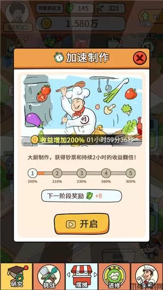 3、解锁完三个摊位后,还可通过加速制作来提升工作效率,赚更多的钱解锁更多的摊位