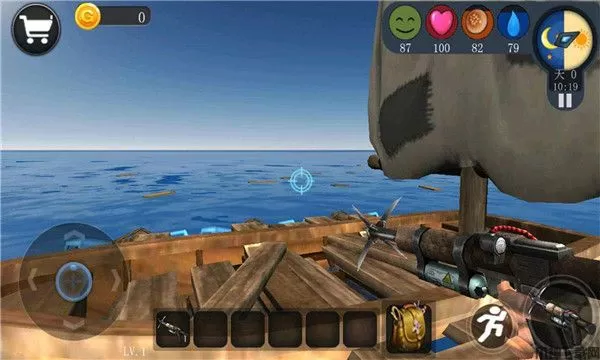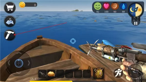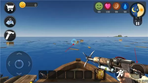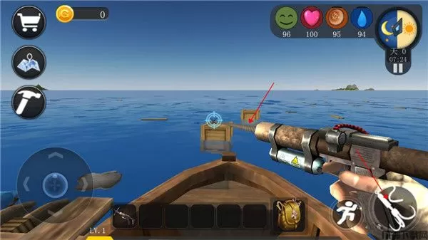 1、游戏开始玩家会出现在一条小船上,通过手中的标枪来获取物资,把准星对准木箱或浮木,长按右下角的图标发射。