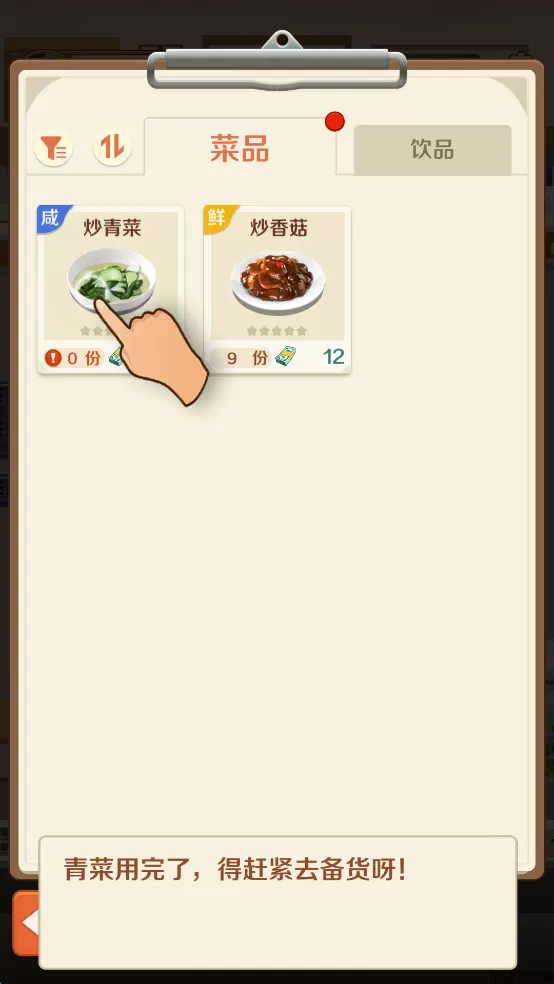 5、可以看到“炒青菜”只有“0份”,“炒香菇”还有“9份”,所以我们缺乏青菜,这就需要老板去寻找材料了。