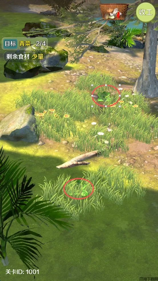 9、在场景中寻找青菜,直接点击即可,也可以带点击周围的野草,有概率出现惊喜。