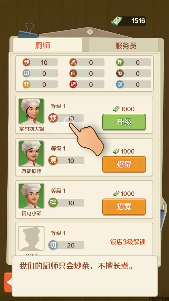 11、菜品的研究需要原材料和资金,以及最重要的厨师,可以看到对“炒”的能力是10,正好满足。