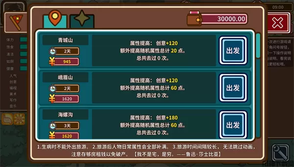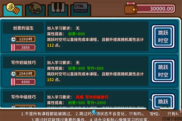 2、整体玩法就是通过各种方式进行学习提升属性,进行作品创作挣钱,在一定时间后进入结局