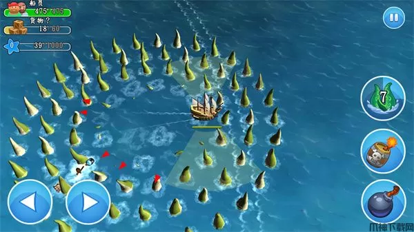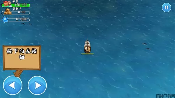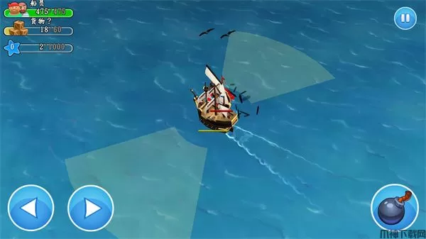 3、游戏操作与前两作基本无异,在大地图上以触屏点击走格子的方式进行前进,每走一步都会耗费行动值,快速点击建筑物或船队可以选择是否进入港口或是在海上进行战斗。战斗中通过虚拟按键进行控制方向,随着重力摇晃机身转向,当敌方舰船进入射程后,触屏点击炮弹图标发射火炮,船的升级还会出现不同的技能等等,同时注意舰船的血量,水手人数,装载货物,行动力等等及时补充。