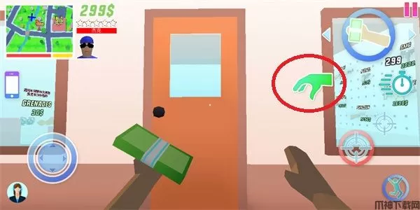 移动轮盘是用来控制玩家进行移动的主要按键,可以说没有它你将寸步难行;在地图的右边显示着我们现在的血量以及金钱,金钱是用来购买道具以及在游戏内游玩的主要物品,玩家尽量多多收集,屏幕的右边的按钮都是主要以交互为主的,例如攻击瞄准等功能;
