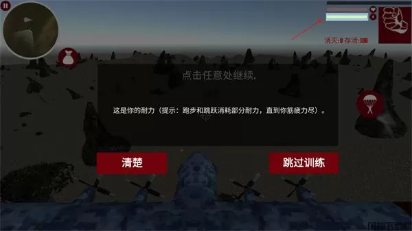 3、下方则是你的耐力,需要注意的是当你跑步和跳跃时会消耗部分耐力,直到你精疲力尽;