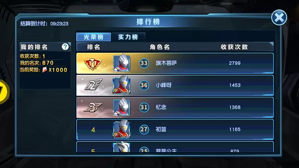 排行榜分为2大块,分别为”光荣榜“,”实力榜“。