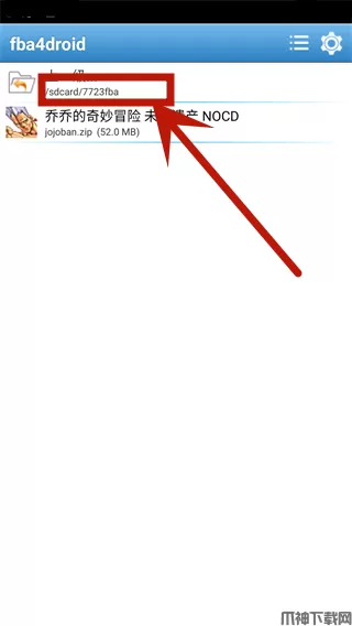 3、进入fba4drioid后点击左上角的“返回上一级”,在目录中找到7723fba,可以看到乔乔的奇妙冒险未来遗产 NOCD的压缩包。