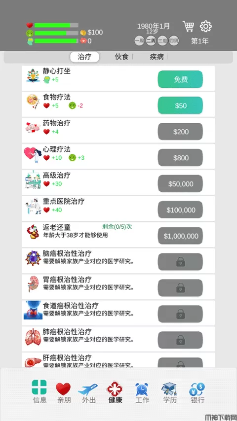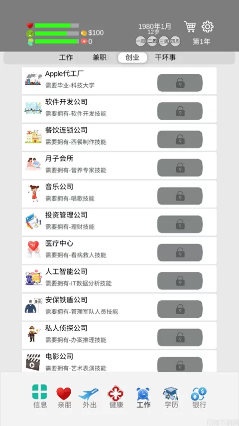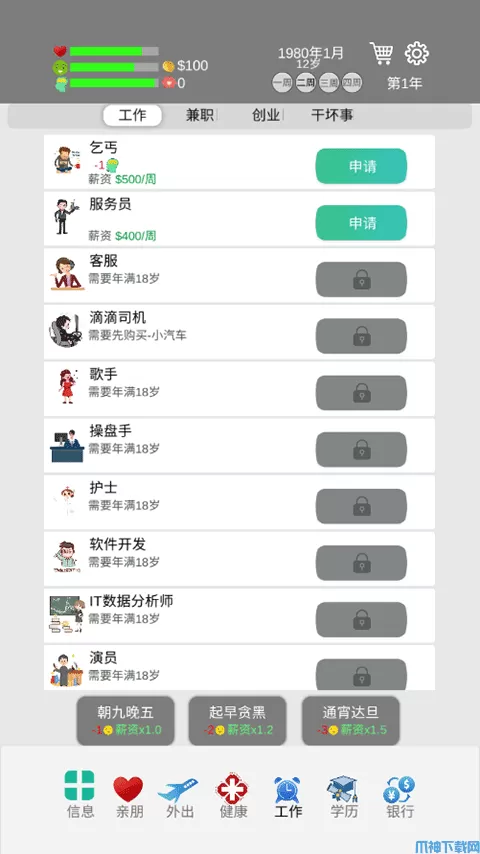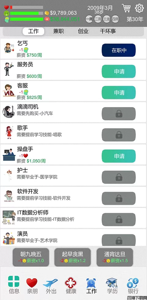 (一定要注意自己的健康值,工作还有学习的时候会耗费健康值,外出可以加心情值)
