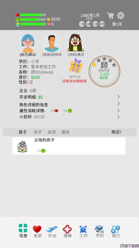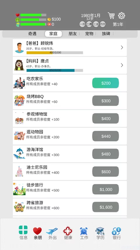 3、进入后就是这样了,如下图,可以看到自己的家庭成员以及详细信息,左上角是健康度,右上角是时间,每次行动,都会推进一次时间的进行哦!