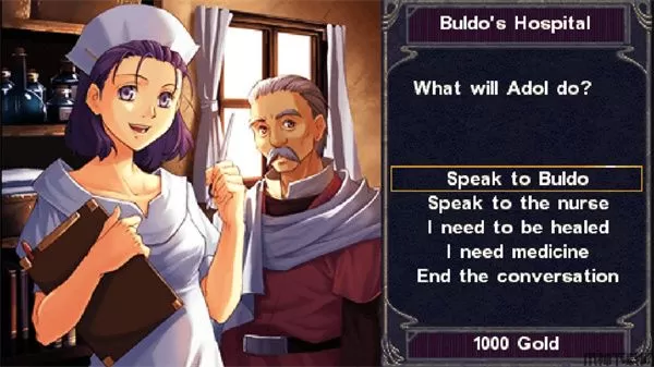 越过一大片的草原(这时亚特鲁身上没有任何的装备和武器,只有一千块金钱,所以在遇到怪物时要快速躲开,否则游戏从头开始),亚特鲁来到了有坚固围墙的米内亚,在街上与人交谈,得知城内一个女占卜师正在寻找一个剑士,可要成为合格的剑士要有一定的武器装备才行,可身上的那一点钱是不够的,想办法赚一点儿吧。在街上与另一名男子说话,得知交易所的主人捡了一枚戒指,往左上来到交易所找皮姆谈话,用身上仅有的钱买下了那枚蓝宝石戒指,来到酒馆在和老板谈话后,再听独眼男人说话,将那枚戒指还给他,得到了一千五百金,赚了,不过买装备还差点儿,听人说在城外的湖边埋着宝藏,到城外去找找看。出城后往北过桥,再往东过两座木桥,拐向南方可以找到一个小湖,在湖的东北角沿湖边走找到一个闪光的东西,是金之台座。返回米内亚城,到交易所卖得了二千金。在城东南进入武器店和防具店分别买了长剑,铠甲和盾,这下装备可齐全了。再到东北城墙角去找一位女诗人雷雅,她说很重要的一把银口琴弄丢了,亚特鲁答应替她留意一下。