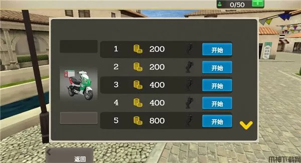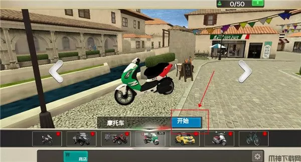 1、首先我们打开游戏,首次进入游戏的时候我们直接一辆小摩托可以使用,我们点击开始