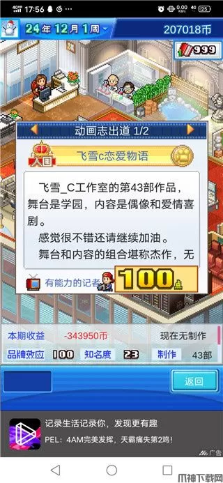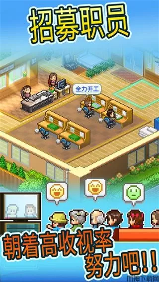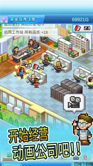动画制作物语最新版是一款模拟动画工作室经营游戏,又叫:动画工作室物语。游戏所有的场景、人物、道具皆为像素风格,颇有80、90年代FC的风格,但精致程度不减,玩着玩着就投入到游戏中,画面真的不是决定一款游戏好玩与否的绝对指标。游戏中玩家需要通过设计面孔、身形和声音来精心打造一个人物角色,然后製作出一部大受欢迎的动漫作品,在萤屏上博得观众的喝彩。其游戏玩法就是招聘员工,制作动画,承包制作,职员培训,而职员系统是整个游戏核心,职员的升级和培训,年薪支撑着公司运营,职员的参数、作画、剧本等技能直接影响动画卖座程度,公司粉丝、广告宣传都是辅助行为,如果职员的能力够强,出现好作品则会变得很容易。随着游戏进行,玩家未来可以租赁更大的办公室,每到年底还有动画金像奖评选,如果被选上将会有额外资金收入。另外,游戏每20年结束轮回仍可继续游戏,还会有新功能增加,并且继承一些属性,喜欢模拟经营游戏的朋友体验一下。