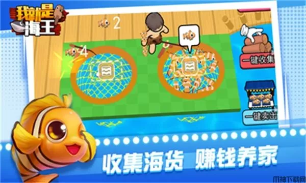 我就是海王是一款模拟经营类游戏,玩家在游戏中将生活在海面,你只有一把斧头和一座木筏,你要做的就是不断的收集各种资源让自己的木筏不断的扩大,并在木筏上搭建属于自己的城市,你可以建设仓库,设置摊位,还可以钓鱼并且与鲨鱼进行战斗,你的唯一目标就是在这里生存下去!游戏采用了卡通的画风,极大的增强玩家的趣味性,同时游戏内还设置了超多的任务等着玩家来完成,当玩家完成一定的任务之后还能获得非常丰厚的奖励,而这些奖励玩家可以用来扩建自己木筏,也可以用来升级自己建筑,让自己的游戏更加轻松有趣,除此之外,游戏主要采用了放置的玩法,对新手玩家也非常友好,玩法简单但是趣味十足!