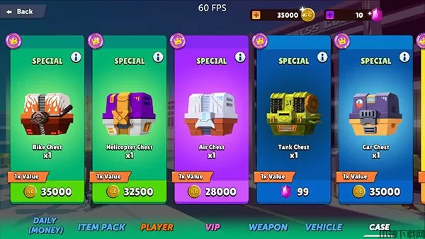 玩家点击左边的Case,即可进行宝箱的购买,可以购买金币宝箱和钻石宝箱,里面有武器、英雄皮肤等奖励。