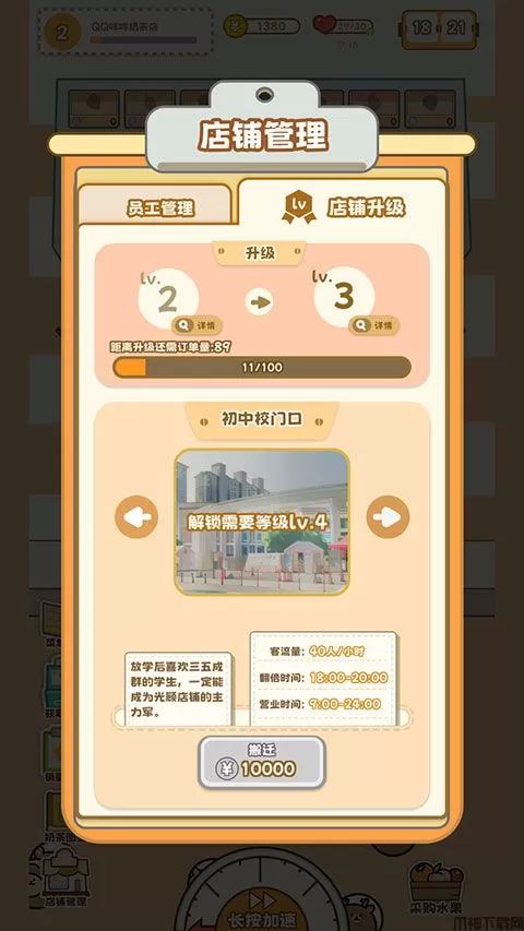 9、当奶茶店提升到一定的等级,还可以在【店铺管理】菜单中对店铺进行搬迁和升级,以获得更多收益。
