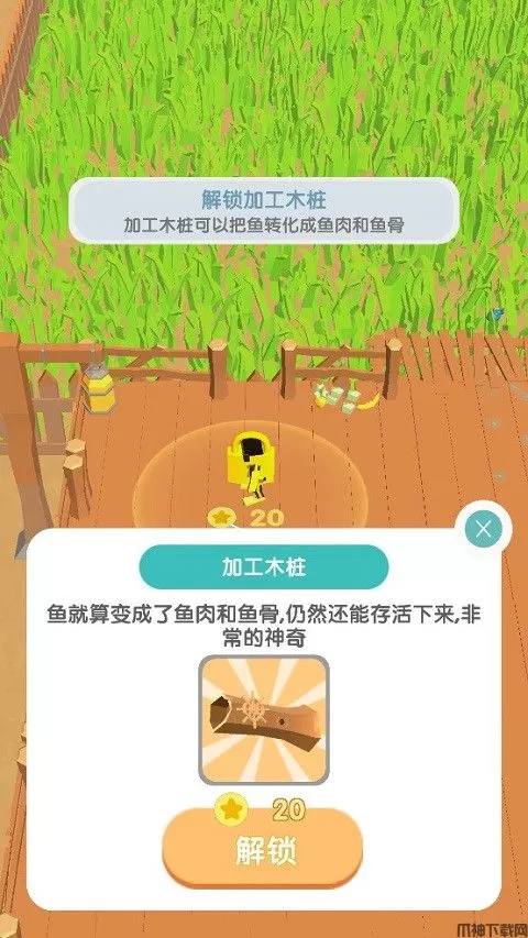 2、具备了原材料的来源,接下来解锁加工木桩,它可以把鱼转化成鱼肉和鱼骨。