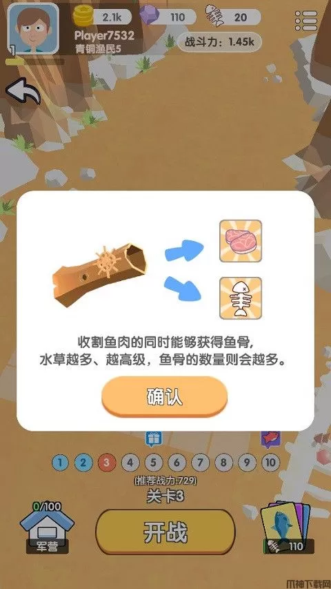 3、士兵升级可以进阶为新的兵种,同时这也是提升战力的关键所在,水草越多、越高级,鱼骨的数量则会越多。为此你需要扩大鱼塘规模,这样玩家不仅能获得养鱼玩法的休闲乐趣,同时鱼骨数量的多少,可解锁其他兵种,如骑士、刺客、法师等数十种职业,更能获得万箭齐发、起死回生等各种辅助技能。