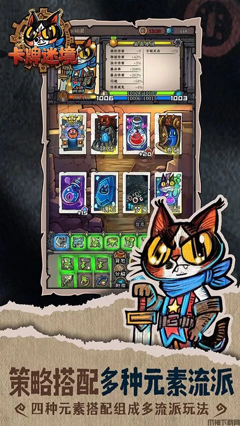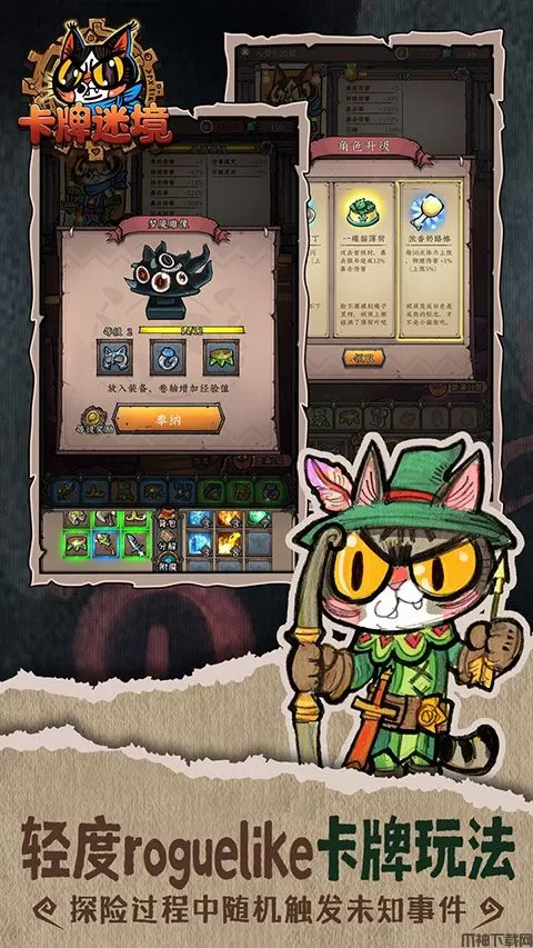 卡牌迷境手游官方版是一款以猫咪为元素,肉鸽玩法为核心的休闲卡牌游戏。独特的画风,新颖的剧情设定,紧张刺激的对决,搞怪的音效,在这里,你需要跟随猫咪勇士,打败猫咪怪兽、猫眼巨人、狂野稻草等发生变异的猫咪,拯救世界。游戏在玩法上,采用了经典的肉鸽玩法,极其简单的战斗方式,增加了大量的烧脑的元素,战斗不仅仅需要勇气,还需要智慧的结合。另外,卡牌迷境手机版以梦境为核心,噩梦与美梦的交织,随着玩家的深入,游戏会逐渐从黑暗恐怖变成清新治愈。独特的结算机制,在保证游戏可玩性的前提下,照顾到了大多数休闲玩家的碎片化游戏需求,所以大家还在等什么,感兴趣的小伙伴赶快来下载体验吧。
