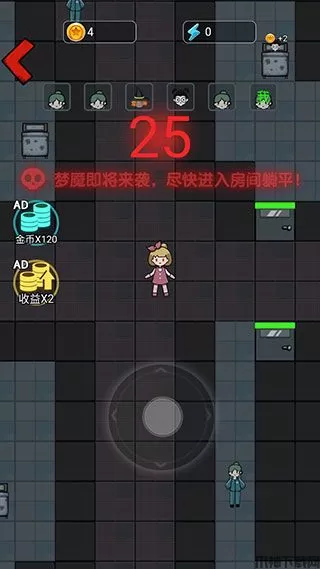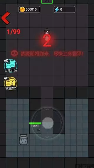 3、进入房间后直接上床,通过睡觉涨金币,建造装备,无论发生什么事千万不能下床,如果有怪人破门而入,也不要下床。