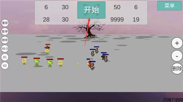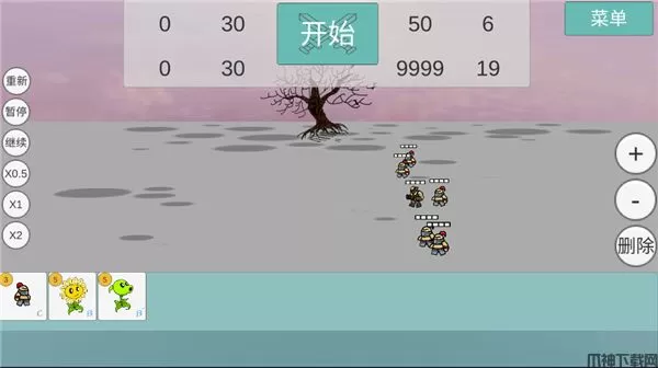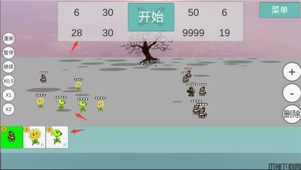 5、布置为此之后,点击上方的开始即可开始战斗,选择3个金币的放在最前面,后面放豌豆射手即可过关;