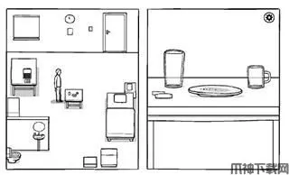 4、点击房间中间2处,使用桌上的食物(两样饮品拖动喝完,中间食物点击吃完,左侧包装点击放大后疯狂拖动糖包可以洒出好多碎屑,总共可以有30粒),吃完后时间变成中午11点。