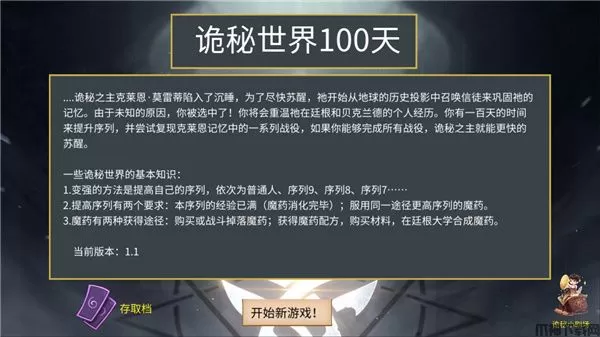 诡秘世界100天是一款根据诡秘之主改编的西方世界、独立剧情冒险游戏。这款游戏完全免费,没有任何付费或者是限制内容,游戏加入了朋克的设计元素,打造出一个无比宏大华丽的克苏鲁世界,玩家将在这里自由探索冒险,不断去经历各种新奇的故事。你也可以利用游戏里存在的一些资源和工具在各个地域寻找材料,进行武器的打造,利用自己的武器去消灭敌人。而且,诡秘世界100天游戏玩法游戏釆用了暗黑的画面风格,营造了神秘而诡异的氛围,画面非常的精致高清。不仅如此,游戏在剧情和场景上都大量的还原了原著中的经典场景和片段,还给玩家提供了众多经典的小说中存在的人物形象,让玩家可以携手经典人物在充满魔幻色彩的战场上展开激烈的厮杀。有兴趣朋友可以下载诡秘世界100天体验哦。