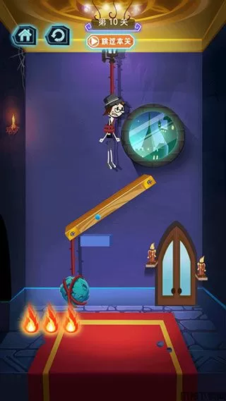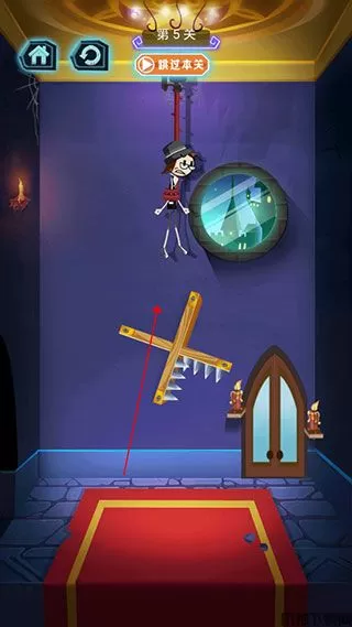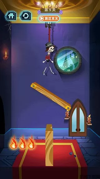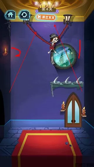 5、这一关,考验的是我们的速度,只要在安全地带割断绳子,火柴人就可以成功出逃。