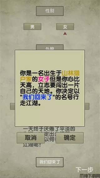 2、简洁美观的放空的武林游戏画面,精彩有趣的剧情故事,你可选择性别和昵称,创建角色;
