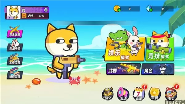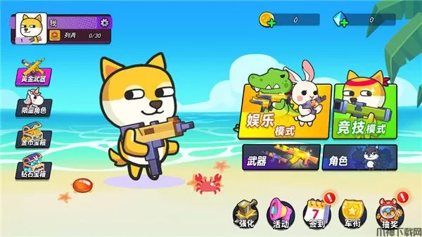 1、进入游戏,我们可以看到由娱乐模式、竞技模式、武器、角色等等功能栏;