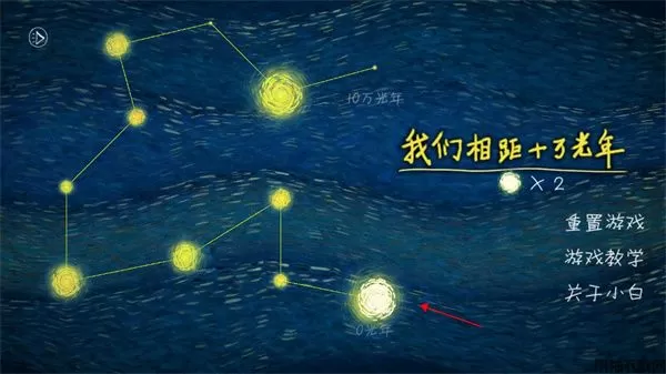 我们相距十万光年官方版是一款极富诗意的休闲类独立手游,游戏的画风取材梵高的作品《星夜》,画面主要由宇宙填满,天空中的星星巨大而明亮,而云彩也随着星光卷曲成一团,画面右上角的巨大月牙金黄耀眼一这 些抽象的"圆圈”使得天空显得充满神秘感。BGM寂静空灵,相当致郁。