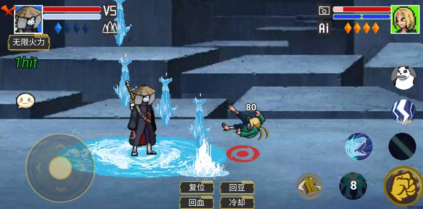 3、经典复古的像素风图形打造的各种帅气忍者,可以操控这些忍者来同其它动漫之中的角色进行格斗。
