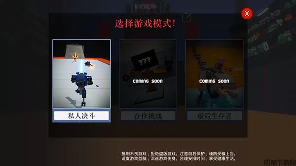 2、然后【选择游戏模式】,目前只开放了私人决斗,合作挑战和最后生存者模式会随未来版本更新而上线。