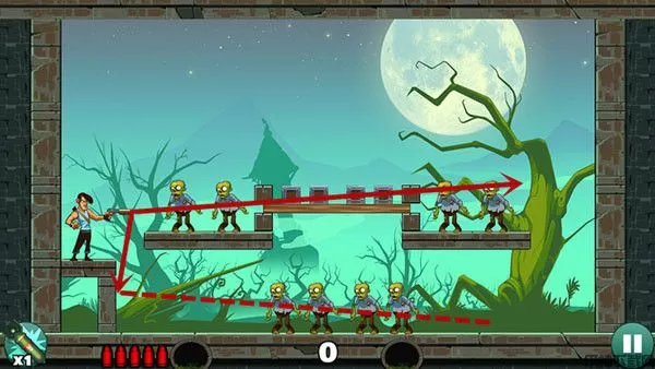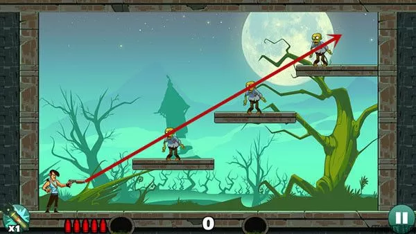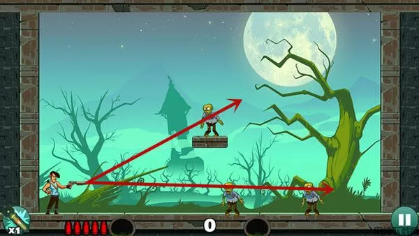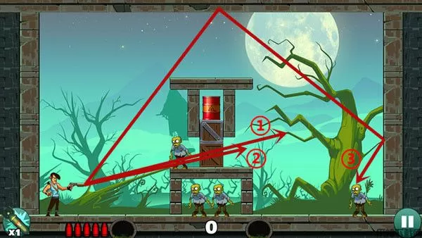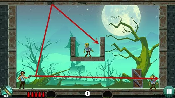 这关过起来最容易,没什么技巧,直接瞄准僵尸射击即可,如果想一发子弹过关不妨多试试不同的角度