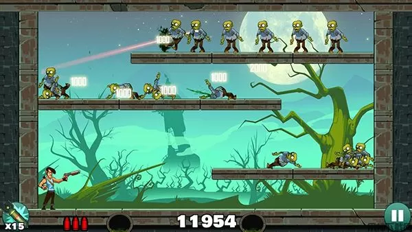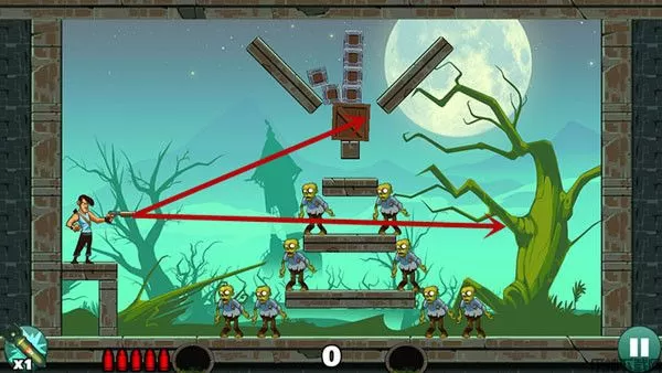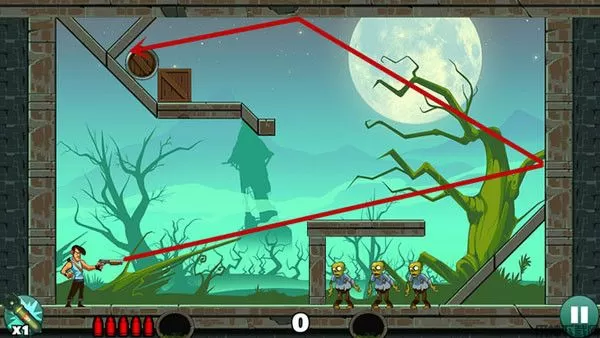 过关的主要技巧就是利用墙壁的反弹和箱子压死僵尸,反弹的位置不好找,这个可以多试几次。在一发子弹没有消失的时候不要打出第二发,万一第一发子弹经过反弹可以杀其他僵尸,这样就造成失误的判断了。如果感觉自己瞄不准可以找个直线的东西比在手机上,这样就可以有个实物的辅助工具了。实在过不去哪一关的情况下可以使用左下角的技能,一个技能轰死所有的僵尸