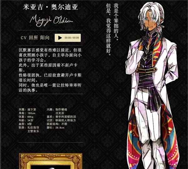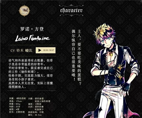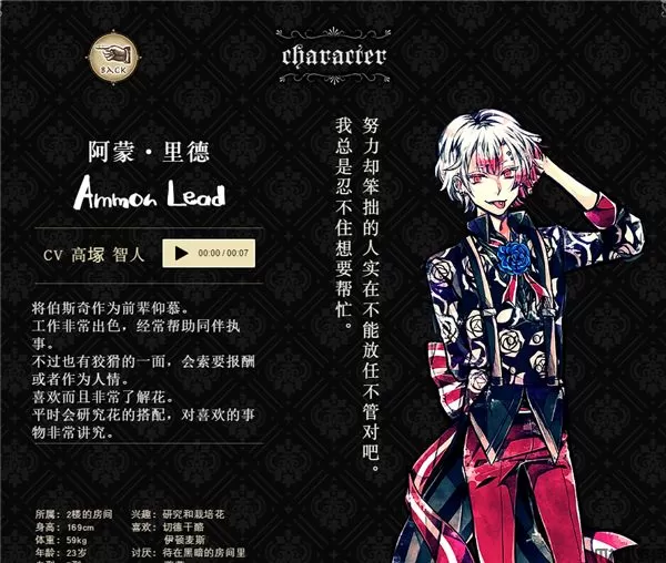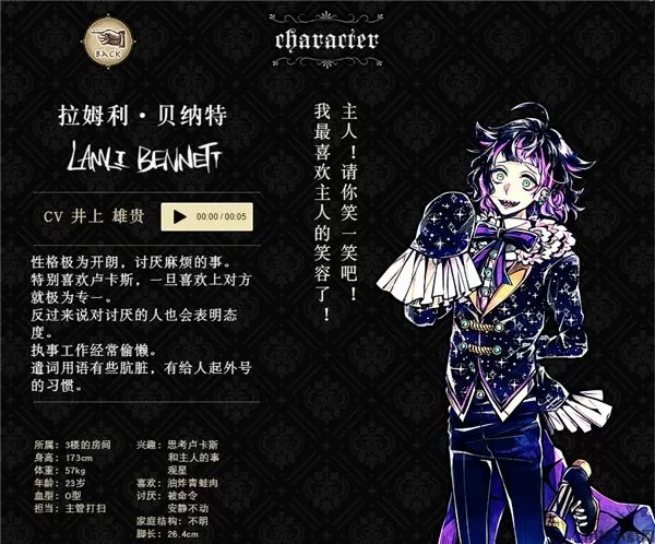 为自己的执事工作感到自豪。时刻挂念要用心照顾主人。温柔又可靠。深受其他执事信赖。很少说起自己的事,是个很神秘的人。