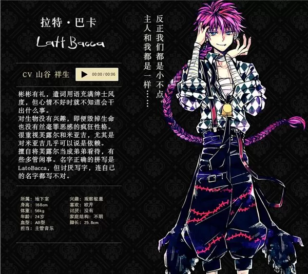 彬彬有礼,遣词用语充满绅士风度,但心情不好时就不知道会干出什么事。对生物没有兴趣,即便毁掉生命也没有丝毫罪恶感的疯狂性格。很重视芙露尔和米亚吉,尤其是对米亚吉几乎可以说是依赖。擅自将芙露尔当成弟弟看待,有些多管闲事。名字正确的拼写是LatoBacca,但讨厌写字,连自己的名字都写不对。