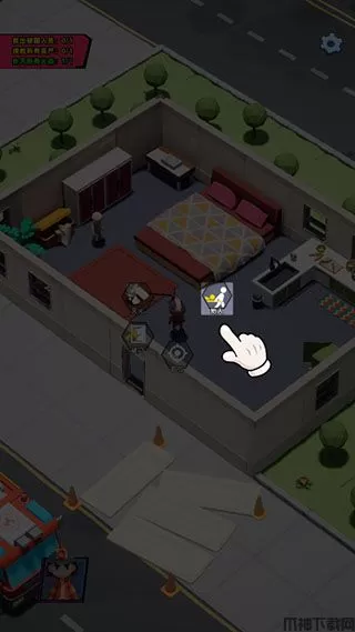 点击人物旁边搬出财物按钮即可让人物进入房间,再点击财物让人物搬出财物,保护财产。