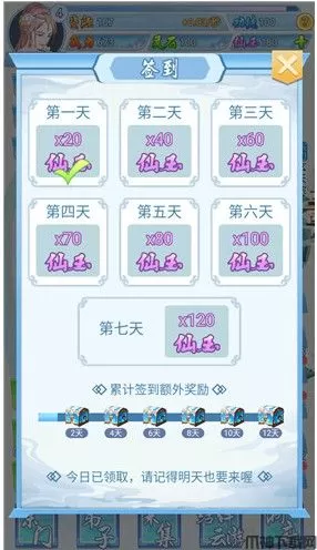 首先就是签到奖励了,这是平民玩家获取仙玉的重要途径,玩家在签到的时候可以获得一定数量的仙玉,签到奖励一般来说七天重置一次,大家不要忘记每天进行签到。
