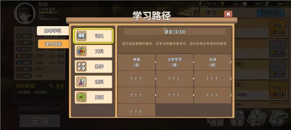 3、在学习路径里面可以得知:语文一共有10项需要学习。那么就是说,在黄冈密卷没有出来之前,你学完4项以上就可以了。最后六项等黄冈密卷出来再每一回合学一下就能学满了。所以在前面就是一直攒悟性,反正最后几轮的时候,我上手有上万的悟性。中间如果需要的悟性值达到最低悟性值或者高个几十点我也会学。