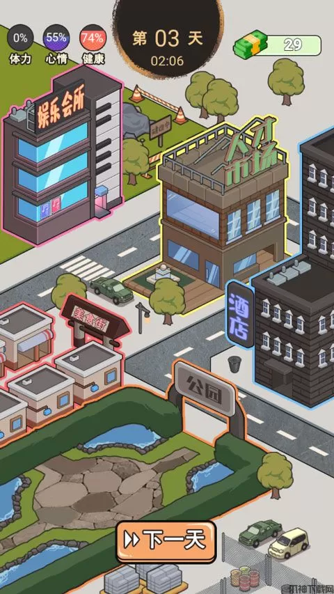 同时,在玩法上以挑战15块钱生活一个星期为主线,将冒险与模拟融为一体,在这里,玩家将化身意外欠下巨额债务的主角,为了能够获得上千万的奖金而参加这个挑战,并开始了为期一周打工生活!你可以在人才市场寻找合适的工作挣取外快,也可以在公园里买小吃、进行鉴宝、尝试投资,还可以在娱乐会所按摩,买彩票,调节自己的心情和状态…玩下来非常有意思!