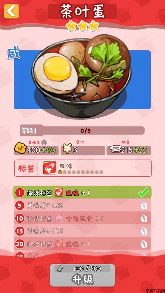 2、不同的菜品有着不同的标签,升级菜品可以解锁更多的标签和升级美味度。
