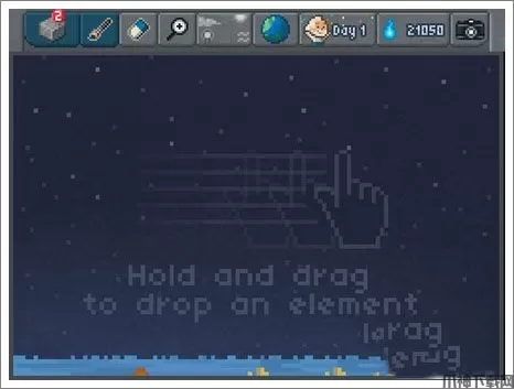 进入游戏是一片水,点击左上角第一个按钮,选择土(soil)和石头(stone)放入水中,一段时间后会得到泥(mub)和沙子(sand),本关完成。