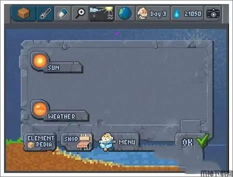 2、利用石头、水和泥土等基础的建筑材料开始建造自己的世界,随后通过种植植物,开垦山脉,创造生命并使用高级工具,来创造更多更复杂的元素。不久之后,你将能够获取无机元素如金属和灯泡等,让你居住在自己创造的自然与科技共存的世界中。