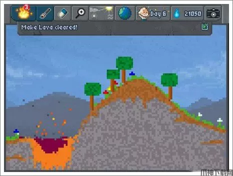 用橡皮在山上挖一个坑,坑里放上油(oil),再用火点燃,得到岩浆(lava),本关完成。