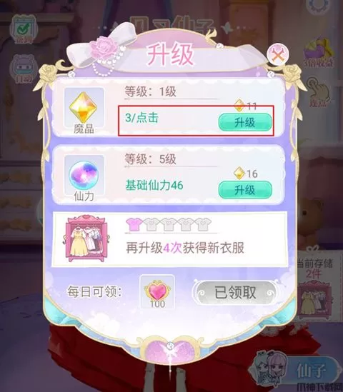3、可以通过提升点击等级来增加每次点击获取的魔晶数量,升级一定次数还能获得新的衣服。