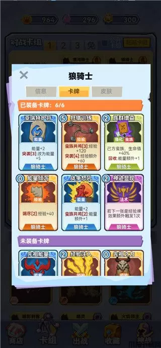 卡牌选择:优先选择能量高的卡牌,有突袭的卡牌,每个角色带一张有竭尽效果的卡牌(保证每个人人都可以冲5),强化牌可以不带,或者带提升蛮族且可以回收加能量的强化牌。 这里给一下,狼骑士的推荐牌组,当然有更好的上位替代也可以替换。法术牌,带两张经验翻倍,一张暗之飞升的过牌即可。