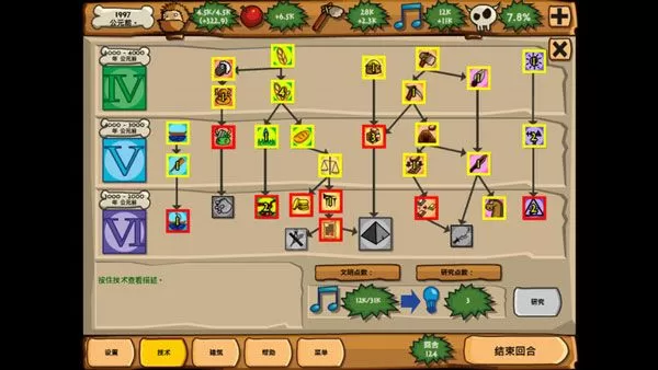 图中下面的技术键是科技升级,看上图中利用文化点转换变化成科学点,有科学点可以研究升级上图中的小表格,上面的小表格中的是各种职业,有扑鱼业,耕种业,牧畜业,拜神业等等。。。。通过升级研究可以增加上面那些所需的数据比如扑鱼和耕种业可以增加食物,根据人口的增加食物需求量也增加了所以要升级研究增加食物的产量。