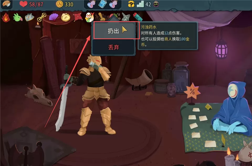 2、将箭头指向商人即可扔出,然后他会给你100金币。