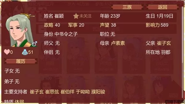 点开个人界面可以看到他的亲戚关系,其中伴侣一栏可以看到夫人(大部分挂虚职),遇到空有品级没有实权职位的夫人,可以直接空降岗位,全家的忠诚度都会暴增(而且夫人们的总体属性通常还蛮好的!),靠着夫人沙龙基本稳过前期
