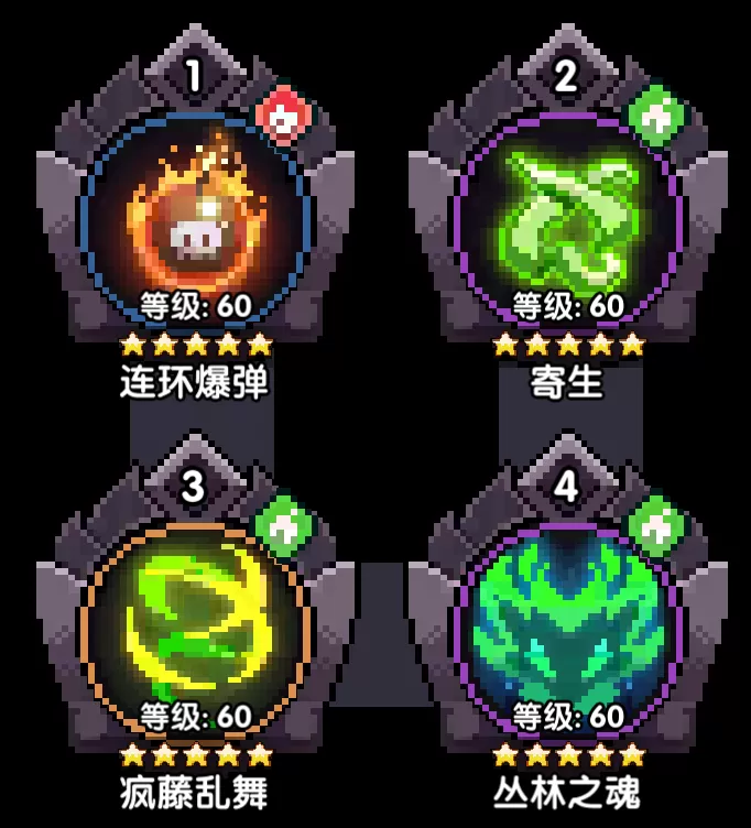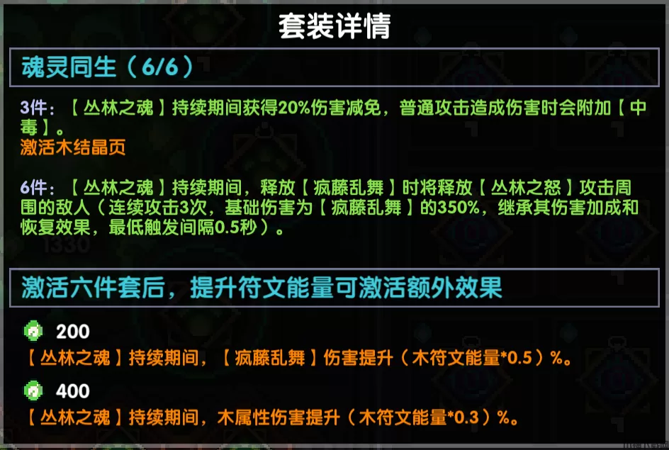 六件套,【丛林之魂】持续期间,释放【疯藤乱舞】时将释放【丛林之怒】攻击周围的敌人(连续攻击3次,基础伤害为【疯藤乱舞】的350%,继承其伤害加成和恢复效果,最低触发间隔0.5秒)